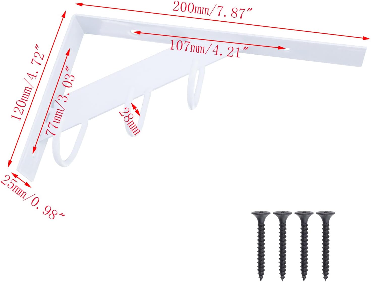 Product Features: Material: Made of metal, sturdy, reliable, not easy to damage and deform, with strong load-bearing capacity and a long service time. Design: The L-shaped design provides your shelf with stable and strong support, and it also comes with hooks, which can be used to hang closet rods as well as other items. Advantage: The installation accessories are complete and can be installed in a short time. Application: It can be used to place green plants, books, books, seasonings, and the hooks on the can also be used to hang cups, clothes, and other items. Specification: Closet Rod Bracket Size: 200×120×25mm/7.87"×4.72"×0.98"(L*W*H). Package Included: 4×Closet Rod Brackets with Mounting Accessories. Note: Due to the difference of light and display, the color of the item may be slightly different from the picture. Due to manual measurement, please allow deviation, thank you for your understanding.