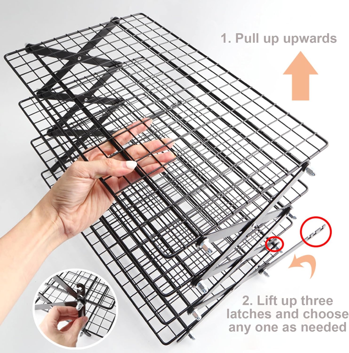 Description: The Collapsible Cooling Racks for Baking make an efficient, solution for cooling baked goods with a four-tier hollow-out iron structure that ensures stability while allowing air circulation for rapid cooling. Designed with adjustable spacing, it accommodates different sizes of cookies, pies, pancakes, and other baked treats while saving counter space by folding flat for easy storage. Its sturdy iron construction resists rust, making it a reliable kitchen accessory for frequent bakers. This collapsible, multi-tier cooling rack allows bakers to cool multiple batches simultaneously, boosting kitchen efficiency and making it suitable for both home and professional baking needs. Ideal for cookie cooling racks and versatile in use, this cooling rack combines practical design with convenient adjustability to enhance your baking and cooking experience. Features:. -Color: Silver. -Material: Iron. -Size: 43.5x45.5x25 cm/17.1x17.9x9.8 inch. Note:Manual measurement, please allow slight errors on size.The colors may exist slight difference due to different screens. Package Including 1 * Collapsible Cooling Rack