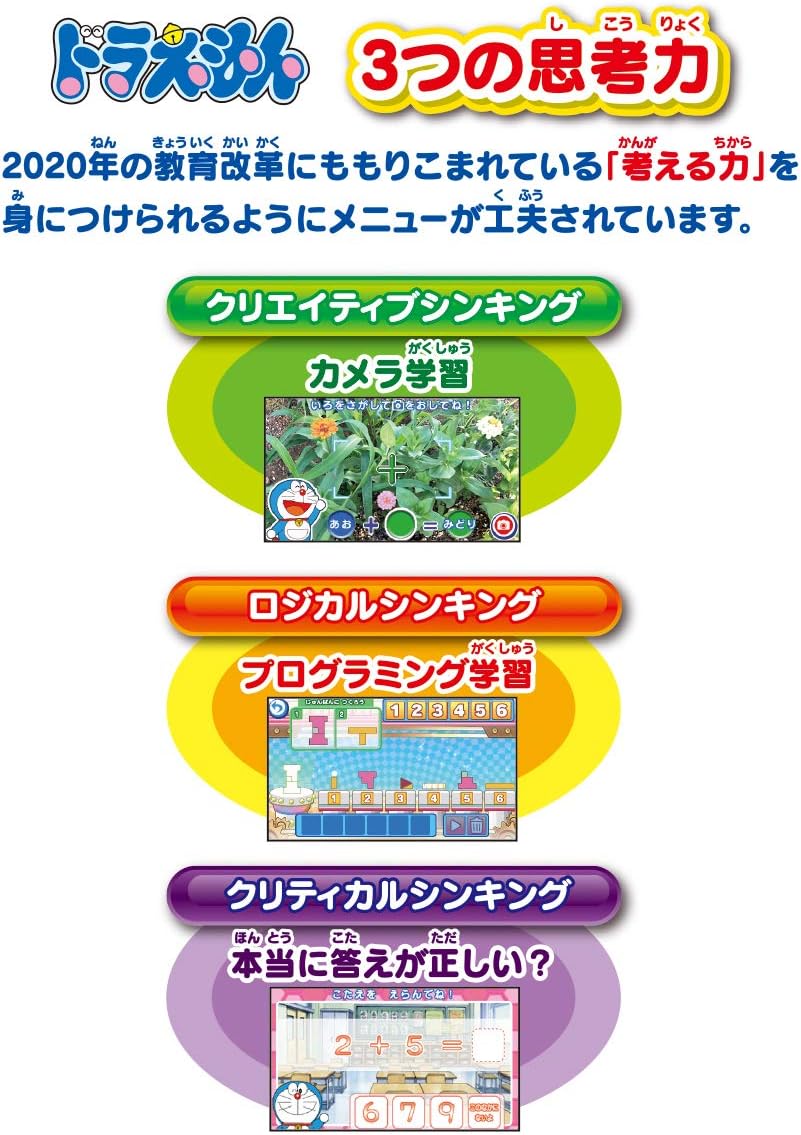 Introducing the Doraemon Draemon Camera Inspirational Pad! Through programming education and camera learning, "Creative Thinking", "Logical Thinking", and "Critical Thinking" A menu is designed to help you develop three thinking. With over 2000 questions to play with Doraemon, you'll be able to learn for years to come. It also has a rich selection of language, math and English menus, making it perfect for kids to get ready for elementary school.