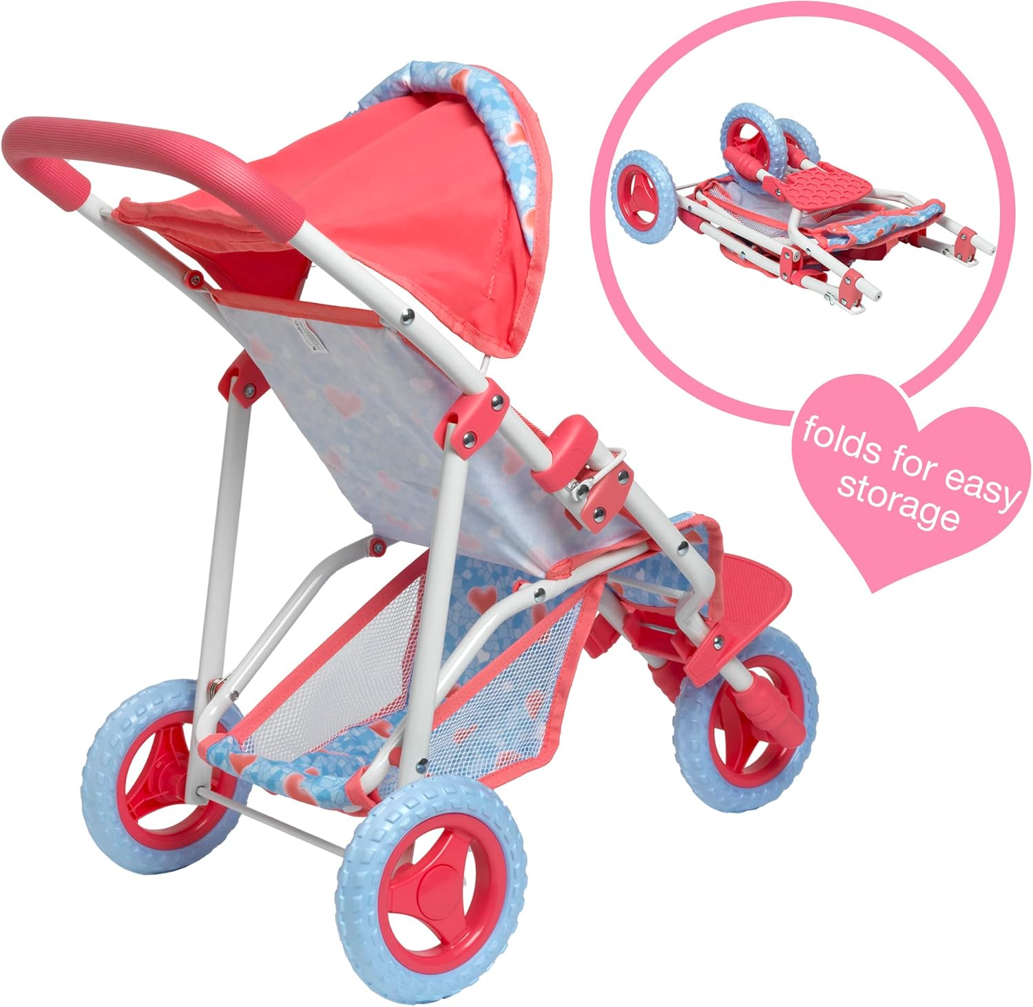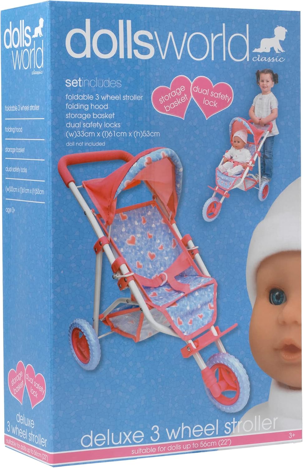 Deluxe Three Wheel Folding Stroller with Canopy and Basket Presented in a Colour Photo Box Suitable for dolls up to 22 inches