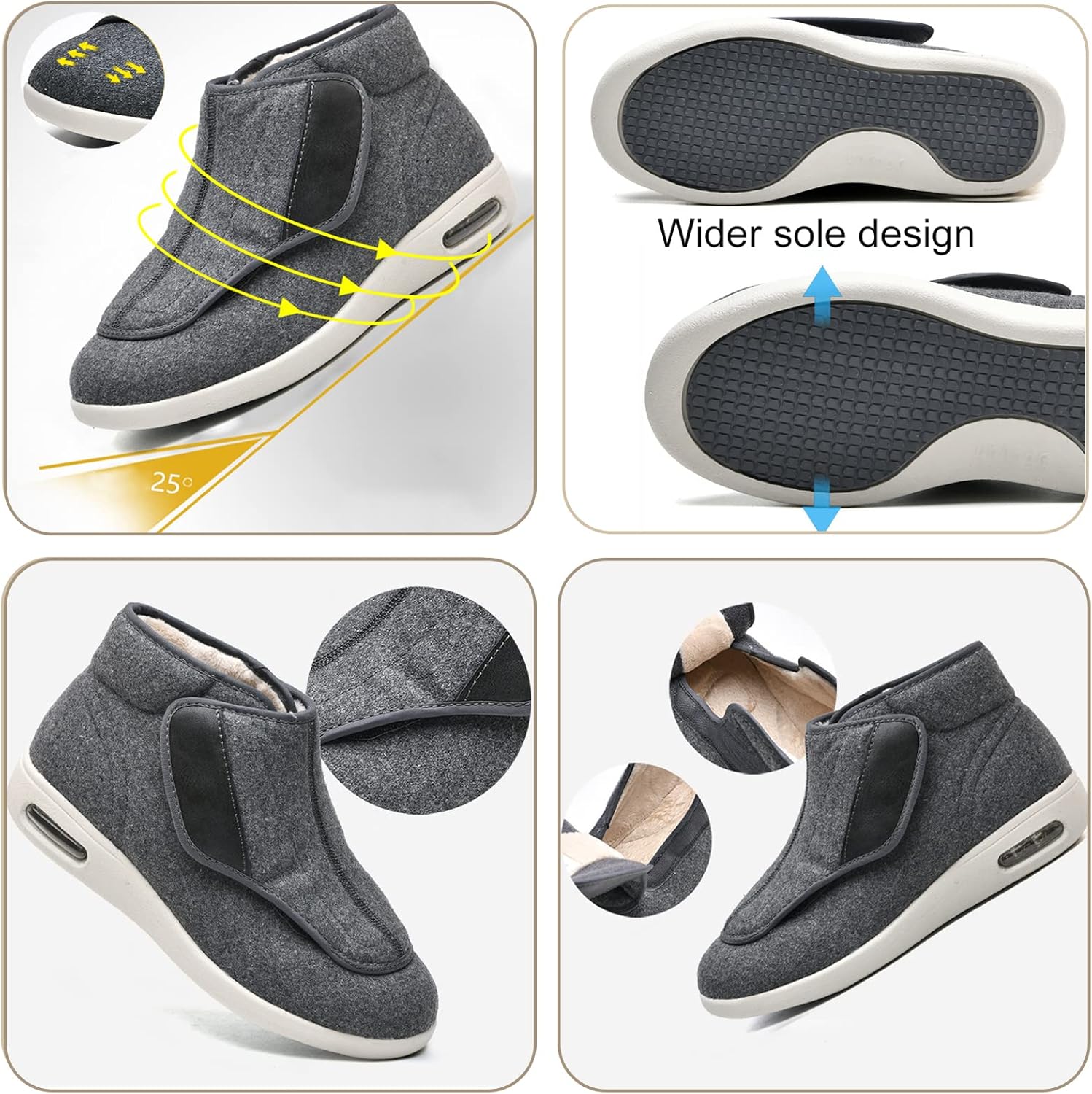 ☀Our super-capacity diabetic shoes have almost no seams, so if you have diabetes and your feet are swollen, they are ideal. ☀They are great gifts for Diabetic Patients, Doctor, Elderly, Hospital Patients, it will bring some help to swollen feet, flatfoot, Hallux Valgus. ❀Features: --Hook&loop design:Adjustable closure for easy to wear or take off. --Rubber sole:Non-slip, you will have a reliable foothold on any indoor and outdoor surface. --Memory foam ergonomic design of the soles to ease the burden of the feet. --Fleece lining to give you the warmth of winter. -Machine washable in cold water, hand wash is recommended. ❀Specifications: Upper Material: Woolen cloth Inside material: Fleece Sole Material: Rubber Toe shape: round toe Insole: memory foam Applicable gender: male Heel height: low heel (1-3CM) Style: casual Suitable season: Autumn and winter ❀The package contains: 1pair x Diabetes shoes ❀High-quality after-sales service: --Please choose the size according to your foot length and foot type. Please refer to the pictures in our size chart to find the shoes that suit you. --If you have any questions, please feel free to contact us, our professional after-sales service team will solve all problems!