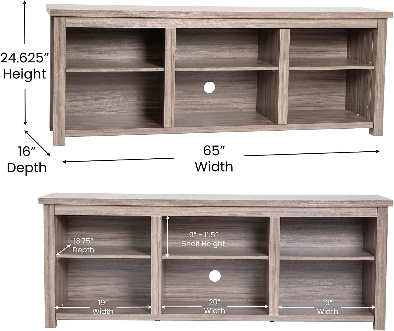 Simple lines and minimalist style abound in this TV stand for up to 80" TV's. Open concept storage and a cord management port are ideal for displaying the newest electronics and family mementos while keeping everything neat and tidy. The updated look of this media center would be a great addition to your new home or would give an instant upgrade to your current space. Mounting your television on the wall above this entertainment center will open up great design possibilities. Additional electronics like gaming consoles and soundbars will fit neatly on the top shelf while decor items can tuck into any of the 6 compartments. The 65 inch top supports 200 Lbs. static weight capacity while the height adjustable shelves hold up to 30 Lbs. to accommodate your display items. Step-by-step illustrated instructions or online PDF allow you to assemble this TV console in under an hour. Fixed plastic floor glides protect your hard flooring surfaces from scuffs and scratches if bumped into. Furniture mover pads can be purchased to help move this unit with minimal effort. Wipe clean with water and dry cloth to keep this storage cabinet looking new.