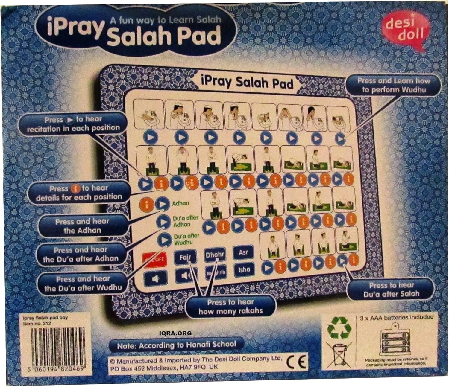 This press, listen, and learn pad with illustrations and sounds teaches children (and adults) how to perform wudhu and salah. Hear the adhan, iqama, and much more. Learn the duas to be recited after the adhan, wudhu, and salah. A great learning tool for anyone wishing to learn salah. Nice illustrations show the steps of wudhu and salah. Press the play buttons under each picture to hear and learn how to perform wudhu and salah. Press and follow each play button to hear the recitation in each position in salah. Press the i button to hear details for each position in salah. Press the adhan button to hear the beautiful call to prayer. Press the dua buttons to hear the dua for after adhan and wudhu. Learn how many rakahs there are in each salah and the duas for after salah. This is a great way to help children enjoy learning the correct way to perform Salah. It is fun, interactive, and innovative. Comes ready to use with 3 AAA batteries included. The boys iPray pad has male voice recitations. It comes with its own very detailed Beginners Guide to Salah to supplement the iPray pad. All teachings in the iPray pad and in the guidebook are in accordance with the Hanafi school of fiqh. Please note that iPray Salah pads are only recorded in English and Arabic. All iPray pads meet all required British and European health and safety requirements, including CE, EN71, and Rohs. The recommended age is 3+.