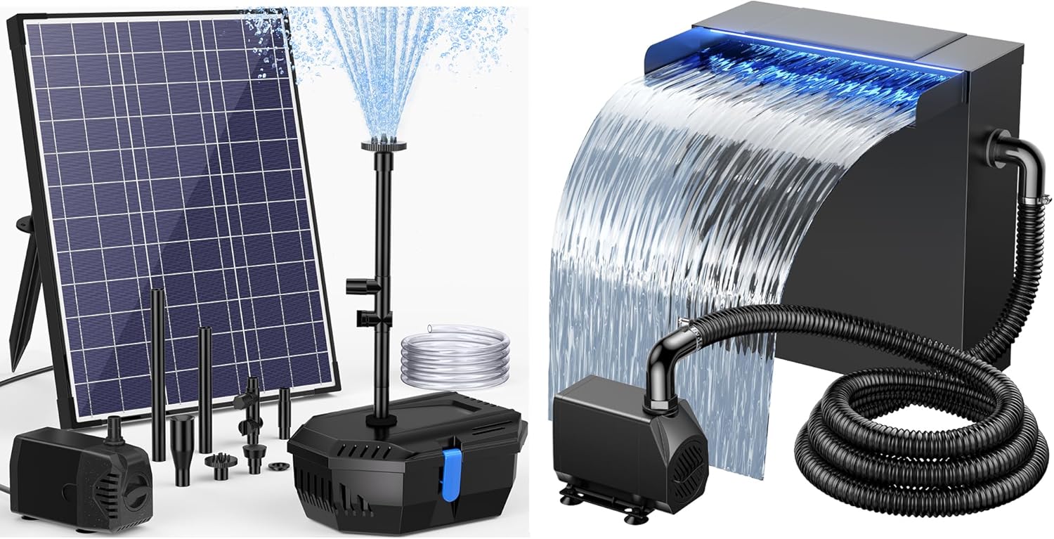 NFESOLAR Solar Pond Filter Fountain, 20W Solar Pond Pump with Pond Filter, 16.4FT Cord, 6.6FT Tubing for Outdoor Small Pond 120-300 Gallons, Fish Tank, Pool, Garden Waterscape N3222 NFESOLAR Pond Waterfall Spillway with Pump Kit, Large 11.8" W 13.4" H Capacity Stainless Pond Waterfall Box with Filtration, LED Lights for Garden Outdoor Pond up to 2000 Gallons N4313