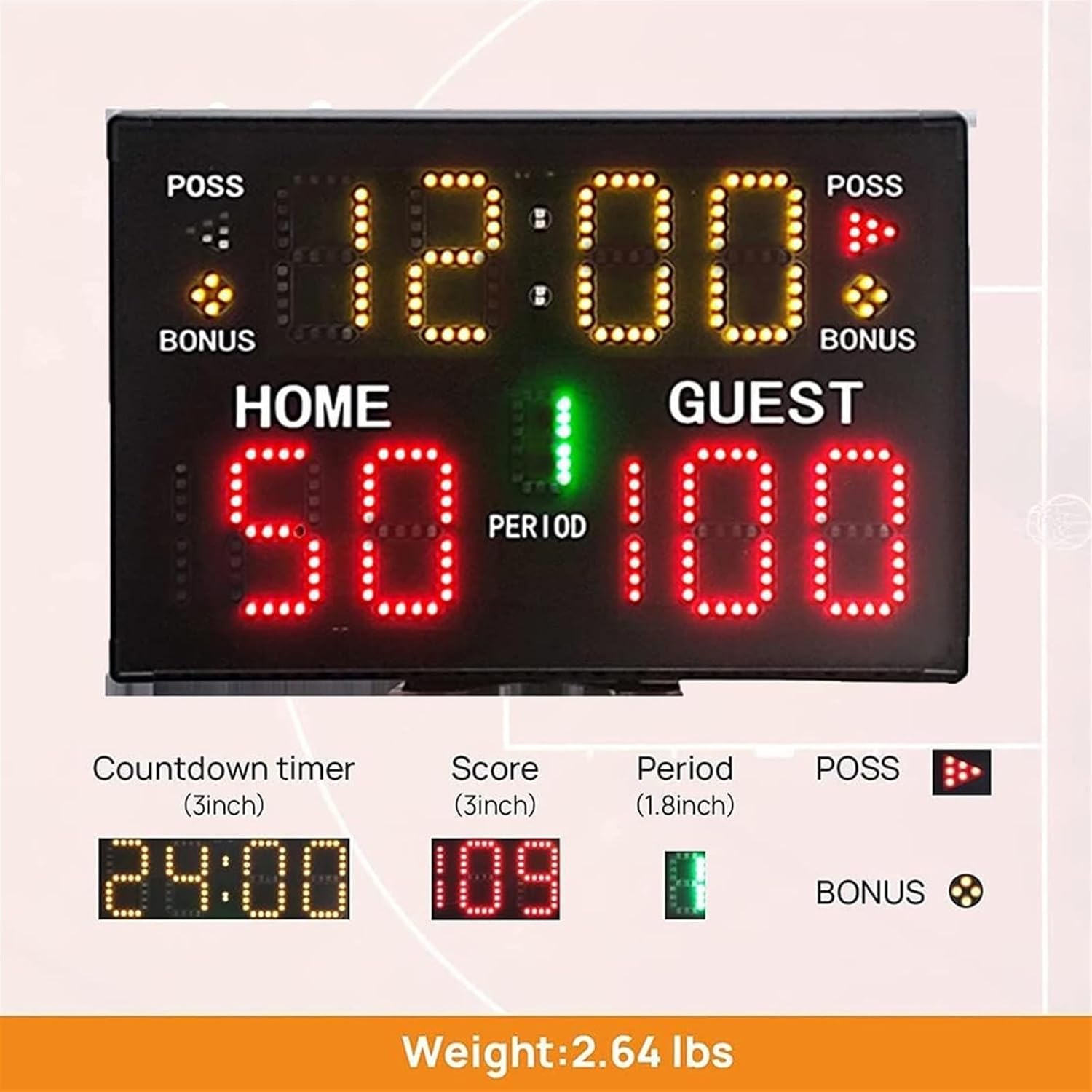 Electronic scoreboard for easy recording of game and event results! Specification: Shell material: profile frame + ABS Appearance color: black Display color: 6 red, 4 yellow, 1 green Brightness: 3000CD Character height: 3"+1.8" Control method: 2.4G remote control Control distance: 30m Visibility distance: 21m /> Sound: Buzzer Volume: 90dB Current interface and voltage: USB cable, 5V/2A Charging power: 7.5 W Charging current: 1.5A Battery powered power: 1.9W Battery supply current: 0.5A Battery voltage: 3.7V Battery type: 18650 (can take 1~3 cells, not included) Dimensions: 37.5 x 25 x 2.3 cm / 14.76 x 9.84 x 0.91 inch Weight: 1060 g Features: - Ultra bright LED display, visible outdoors, long lifespan. - Built-in 90dB buzzer. When the countdown is over or the attack time is up, there will be a prompt sound. - All-round remote control, simple operation, comprehensive 360° control, the scoreboard can be within a range of about 30m with full function control. - The package comes with brackets and screws, easy to hang on the wall of the playing field. Package Includes: 1x Scoreboard 1x Remote Control 1x Cable 1x Set Installation Accessories Note: Please allow slight errors due to manual measurement and different monitors.
