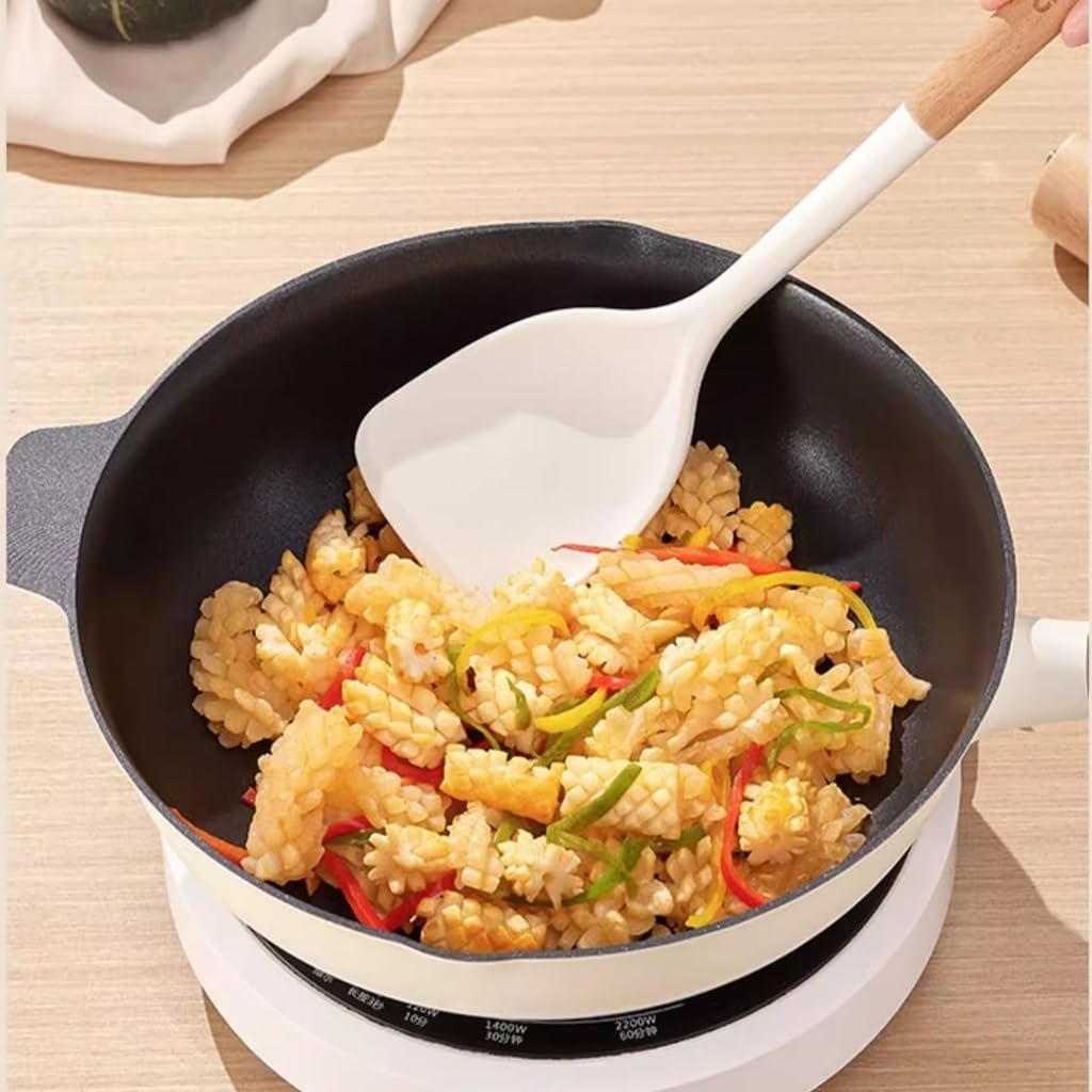 And lightweight, not afraid of frying or splashing hot oil.Safe to use at high temperatures, with no deformation after prolonged use.High temperature cooking has no odor, making it more reassuring for you to use.Spade surface hollowed out, automatic oil filtering, fried and grilled with oil saving edges sloping, fitting well without damaging the pot.The package storage and hanging hole fitting hook are convenient for storage and use.Name: Kitchenware SetMaterial: SiliconeColor: As shown in the pictureNumber of pieces: 4Specification: Kitchenware set * 11. Due to screen display differences, there may be slight color differences in the visual. Please refer to the product received.2. Manual measurement may have slight errors, please understand.Best slotted spoon for deep frying chickenStainless steel slotted spoon with wooden handle
